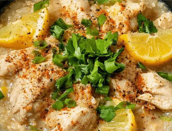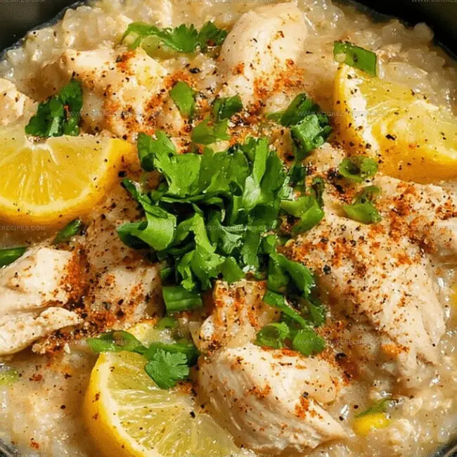 Soft chicken pieces nestle among creamy rice, inviting you to savor slow-cooked goodness.