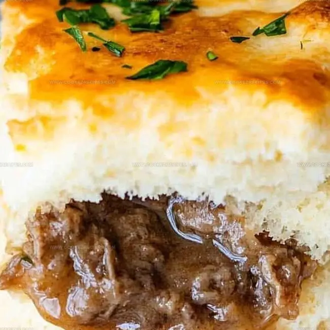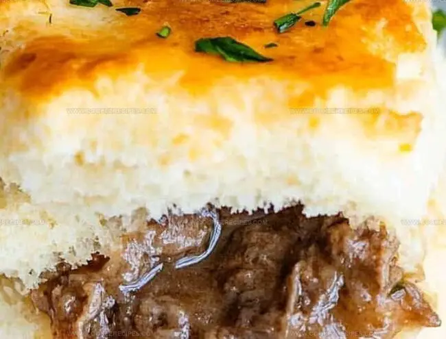 - Drizzle au jus sauce over the entire dish, infusing the biscuits and meat with deep, savory flavor.