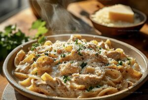 Comfort meets creativity in this hearty chicken pot pie pasta that blends classic American casserole flavors with creamy pasta perfection. Rich with tender chicken, golden vegetables, and a velvety sauce, you’ll savor each comforting bite of this soul-warming dish.
